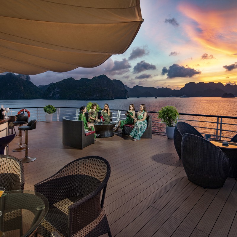 17:30 – 18:30: Thưởng thức tiệc hoàng hôn trên boong tàu với trà nóng, trái cây và bánh ngọt. Quý khách có thể ngâm mình trong bồn Jacuzzi, tắm nắng, chụp ảnh hoặc tận hưởng chương trình “Giờ Vàng” – mua 2 đồ uống tặng 1 tại quầy bar.