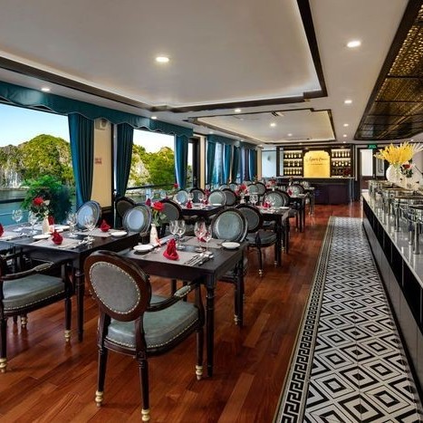 19:15: Quý khách thưởng thức bữa tối được phục vụ tại nhà hàng trên du thuyền.