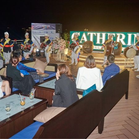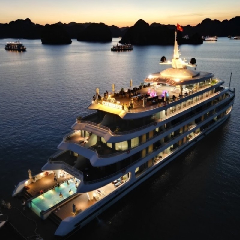 Du thuyền Catherine sở hữu không gian sang trọng, tiện nghi với phong cách Đông Dương ấn tượng sẽ được khai trương vào tháng 6 năm 2023. Du thuyền mang dáng dấp của một siêu du thuyền 6 sao, kết hợp giữa phong cách Đông Dương và sắc đỏ quyến rũ của hoàng hôn trên Vịnh Hạ Long tạo nên một không gian sang trọng với thiết kế trang nhã cho cả hành trình. Bên cạnh đó, vẻ đẹp dịu dàng của người phụ nữ Á Đông còn được tô điểm bởi những họa tiết đường cong trên trần nhà và những hình ảnh trừu tượng.